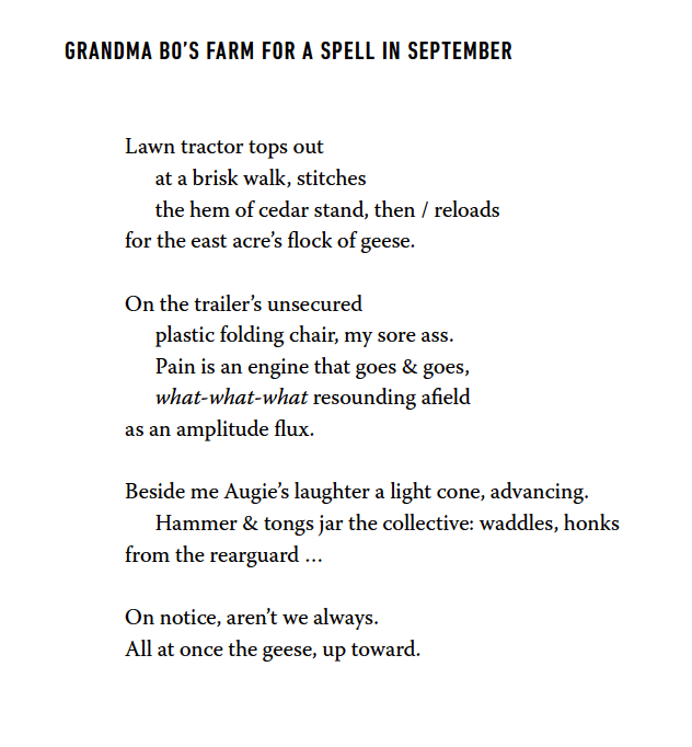 In the first section, the sonnets really made me work to try to read them as sonnets, and not just snatches of thought made possible by the holy algorithm of human consciousness, but then I decided they were both. Here is a prime example of one sonnet from the first section called “Grandma Bo’s Farm For A Spell in September”: