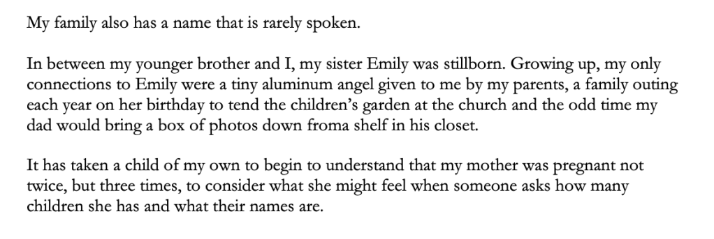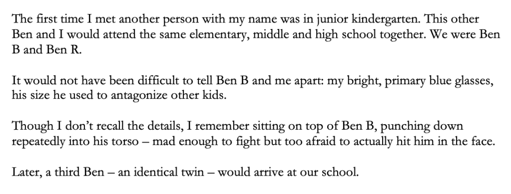 Through The Book of Benjamin, the weaving of name and self ripples out into elements of family, from his parents and siblings, to him becoming a father himself, which can’t help but evolve into a conversation, and a book, for, about and through his lost sister. In many ways, The Book of Benjamin is less a book about the author and his name than a book that allows her, the late Emily Robinson, to be acknowledged, and discussed openly, and the rippling effects of both her and that unfathomable loss. As he writes: