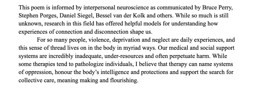 I’m fascinated by how Siebert works to cohere what might, at first glance, seem akin to the two halves of her self—the poet and the therapist—meeting and interacting across a single, book-length engagement. Her “Notes” at the end of the collection speak to the depths of two seemingly wildly diverse practices coming together, suggesting the work a kind of study across and between two poles, providing a clarification and articulation that might not have been otherwise possible. “pretty is a source / of comfort source / of terror,” she posits, further in the third section-sequence, “her unsoothable / attraction // the next and the next and the next / some / with hands that go / peaceful or dormant / some with suddenly flooding fists never / again fists / humming easy death fists / curing you fists feeling / nothing fists [.]” Her notes on the sequence “Somatic psalms” offers: