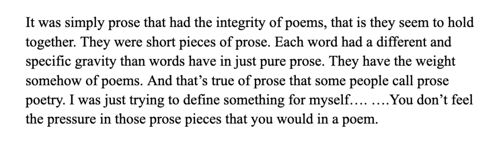 The book covers a personal relationship between 2014-2019, and the aftershocks of its eventual breakdown in the pandemic years that followed. No Credit River calls these prose poems “poems” and they really are, but not in the way many see or read poems. Now, I don’t want to get bogged down in an argument about prose poems, but as I was reading this book, I did think about what the American poet Mark Strand had to say about his own prose poetry in Guernica Magazine: