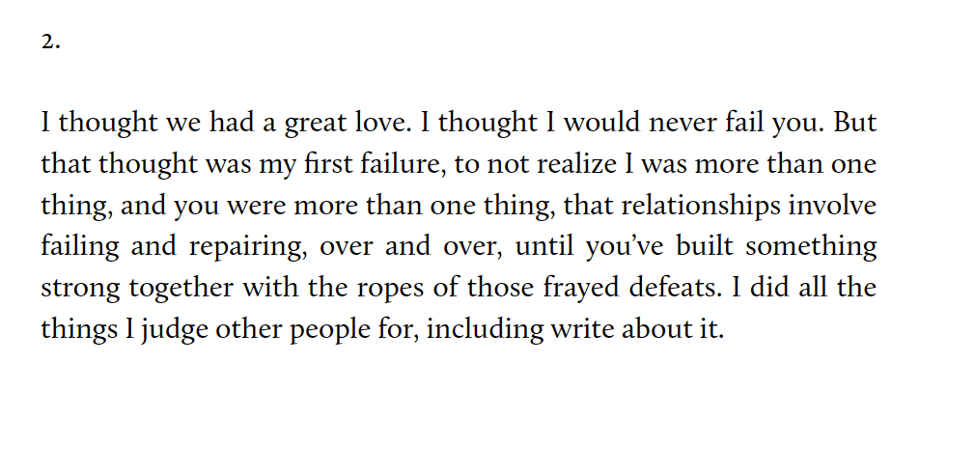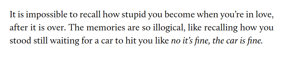 After reading this, I knew this collection was going to be special. Not simply because of the clear-cut honesty and emotional weight of poems like this one, but also because of the smooth controlled cadences of each phrase, as if every word was inevitable. As you read this book, so many perfect moments or small wisdoms stood out to me like here in “I’d like a Double Espresso and The National On Repeat”: