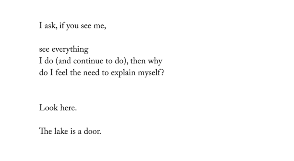 The immediate connection to Atwood’s “This Is A Photograph Of Me” gives me shivers here, and the image of the lake as a door is striking as if Johnstone the poet is saying just beyond this door, or perhaps more apt, underneath it, we might coax a little human understanding, or lure the collective unconscious, to the surface.