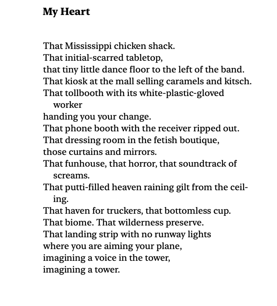 I also love the play of humour and seriousness and surreal associations in the work of Bob Hicok, the exuberant non-sequitur poetic style of Dean Young, the anger and narrative torque of Philip Levine, the introspective sweeping meditations of Larry Levis, the wit and pop culture references and descriptive imagery of Kim Addonizio. Look at this small poem called “My Heart” from Addonizio’s Lucifer at the Starlite: