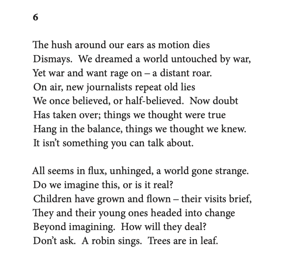 Beyond the delicious rhyme structure, the poet is grappling with age, the many-headed hydra of War,  a scourge that never really left, a world order in a state of flux, and the poet’s doubts arriving to ask, have we made a difference? Could we have done things differently? Especially for those “young ones headed into change / Beyond Imagining. How will they deal?” As the father of children growing into young adults, I find the paradox of doubt and hope, the wilful but perhaps necessary blindness in the last line of this poem, both comforting and haunting.