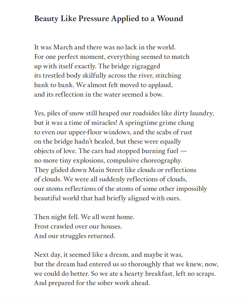 This is a terrific poem and I love the synergy in the lines, “We were all suddenly reflections of clouds, / our atoms reflections of the atoms of some other impossibly / beautiful world that had briefly aligned with ours.” The juxtaposition of the cloud’s physical reflection upon the Earth with that inner sensory reflection our consciousness gleans is a holy thing in this poem, and comes as close to apprehending some underlying permanence in this life, even if the feeling fades once “Frost crawled over our house. And our struggles returned.”