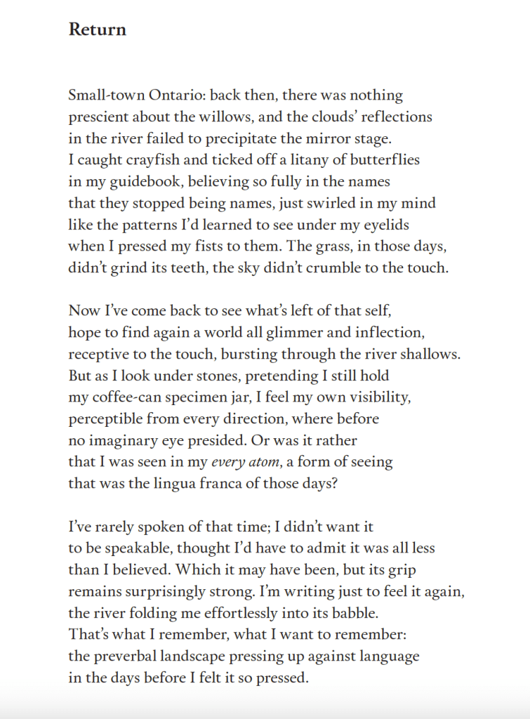 Another poem I quite liked was the poem “Return” which appealed to my own experiences of growing up in small-town Ontario, but the same themes of building relationships with others, and finding a connection to the outside world through the self’s apprehension of the beautiful amid the mundane is again taken up here: