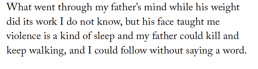 Besides the mother figuring prominently, there is also a father who, though much loved, is somewhat described in distant unknowable terms like in these lines from the poem “All My Life I Have Been Shielded By Violence” where the poet’s soldier father kills a squirrel that had its back legs run over by a car: