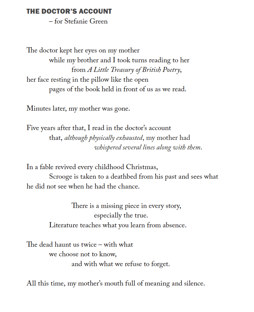 These lines really take me a little aback, the idea of “violence is a kind of sleep”, but it is really the death of the poet’s Mother which is the central motif in the whole poetry collection. Take for instance this poem called “The Doctor’s Account” where the mother’s final moments are with her family listening to much loved poems: